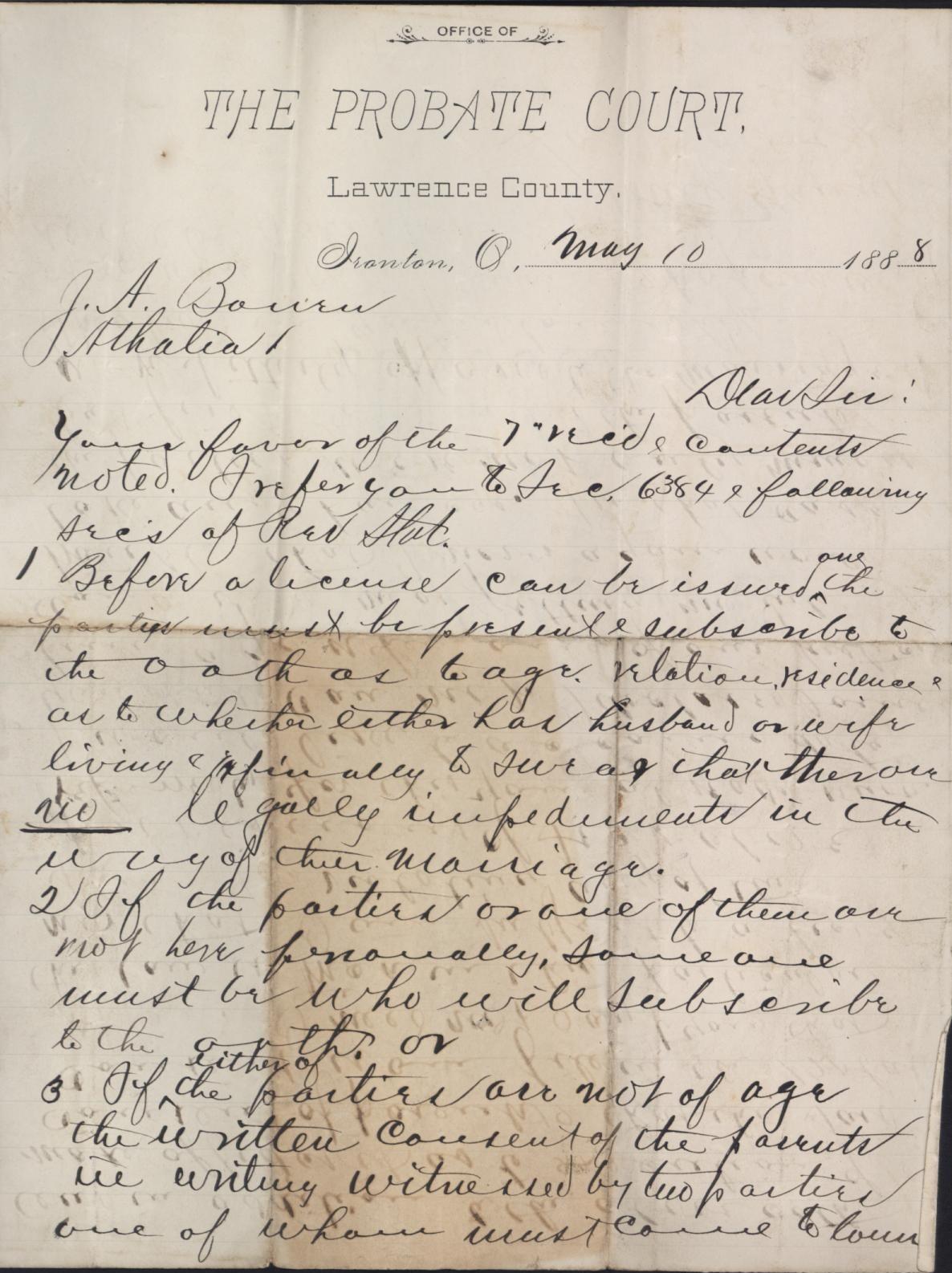 THE PROBATE COURT, LAWRENCE COUNTY, Ironton, O, May 10, 1888 Athalia Dear Sir: Your favor of the 7.00 rec'd & contents note. I refer you to Sec. 6384 & following secs. of Rel Stat. 1. Before a license can be issued one of the parties must be present & subscribe to the oath as to age, relation, residence & whether either has husband or wife living and finally to swear that there are NO legally impediments in the way of their marriage. 2. If the parties or one of them are not here personally, someone must be who will subscribe to the oath. Or 3. If either of the parties are not of age the written consent of the parents, the writing witnessed by two parties, one of whom must come to town and in addition to the above oath make affidavit as to execution of consent of parents & that the said consent is on file in the Probate office. I need not say to you that the law is tri?? in this particular nor that I am subject to a heavy fine for violating any of the provisions of Secs. above referred to, for this you already know. I would like to accommodate you but can not. I declared some time ago when one of our justices came very near getting me into trouble that I never again would take any chances. In that case the parties were not only minors but first cousins & the parents were bitterly opposed to the marriage. They live in your township. I return your money and hope all will be satisfactory. Truly Yours |